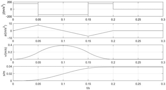 During the motion process, the rate of change of the acceleration remains constant. Let the absolute value be J0; then, in each motion phase, the rates of change of acceleration J(t), acceleration a(t), velocity v(t), and displacement s(t) over time are as given by Equations (1)–(4).