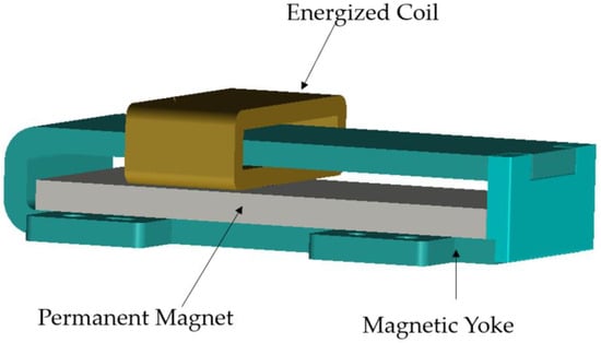 To meet the requirements of the zoom lens group’s motion trajectory and the total zoom travel time, it is essential to design the VCM structural parameters appropriately [23,24] with the limitations in the lens size and power. The basic principle is that the electromagnetic force generated by the VCM should exceed the required maximum driving force, and VCM structural design includes the structural layout design, magnetic circuit parameter design, and coil parameter design. The structural composition of the VCM is shown in Figure 6.