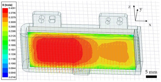 According to the structural parameters of the VCM in Section 3.3.1, the magnetic field strength of the magnets and yoke is simulated in ANSYS. The simulation results are shown in Figure 9. The results indicate that throughout the entire travel range, the minimum magnetic field strength is greater than 0.15 Tesla.