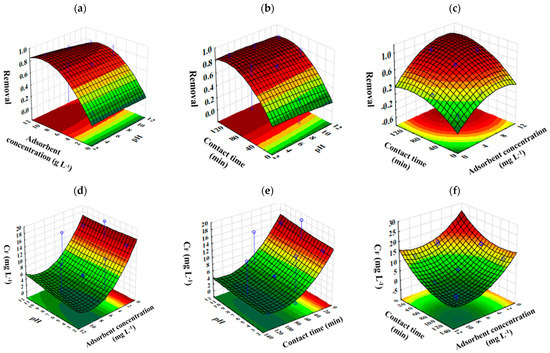 Response surfaces for RCAF and CF as function of pH and adsorbent dosage (a,d), pH and contact time (b,e), and adsorbent concentration and contact time (c,f).