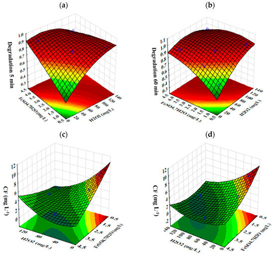 The CF of caffeine ranged from 0.21 to 7.82 mg L−1, while caffeine degradation ranged from 58.72% to 98.92%. The second-order models that relate caffeine degradation and caffeine CF as a function of the independent variables for the Fenton reaction times of 5 and 60 min are presented in Equations (16)–(19).