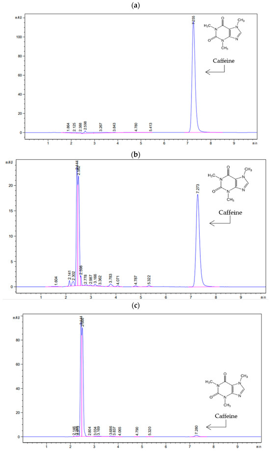 Caffeine chromatograms of the initial solution of 20 mg L−1 (a) and after 5 min (b) and 60 min (c) of the Fenton reaction (H2O2/FeSO4·7H2O = 150/4 mg L−1).