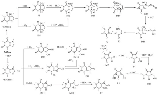 Theoretical degradation route of caffeine by hydroxyl radicals.