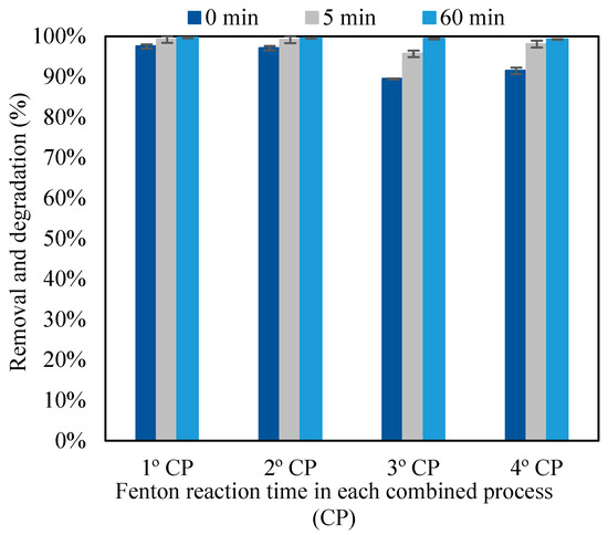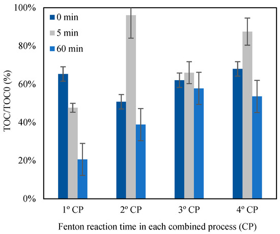 Figure 3 illustrates that under the investigated conditions, there is degradation of the contaminant, resulting in the formation of smaller-chain molecules with lower molecular weights and retention times of less than 7 min. To prevent the creation of potentially hazardous secondary waste, pursuing mineralization becomes crucial. Byproducts formed in this process might possess greater toxicity compared to the original molecules [39]. The rate at which hydroxyl radicals are generated relies on the oxidative potential of the procedure, directly impacted by the reaction rate outlined in Equation (1).