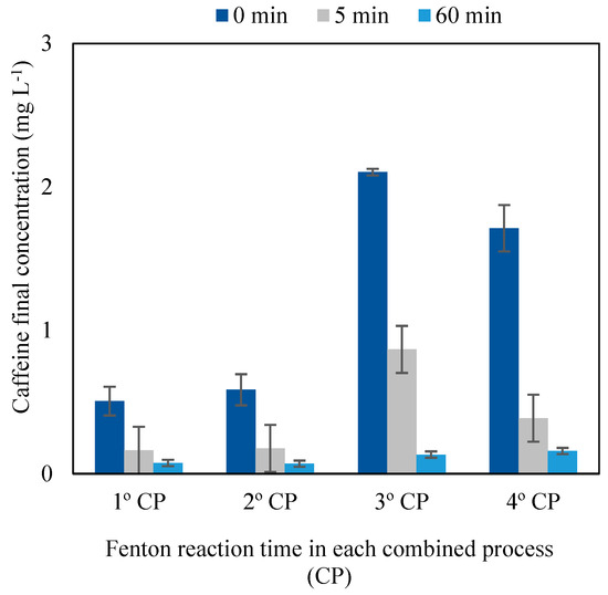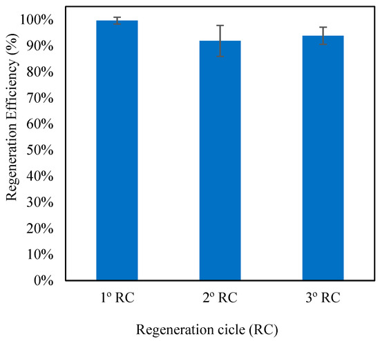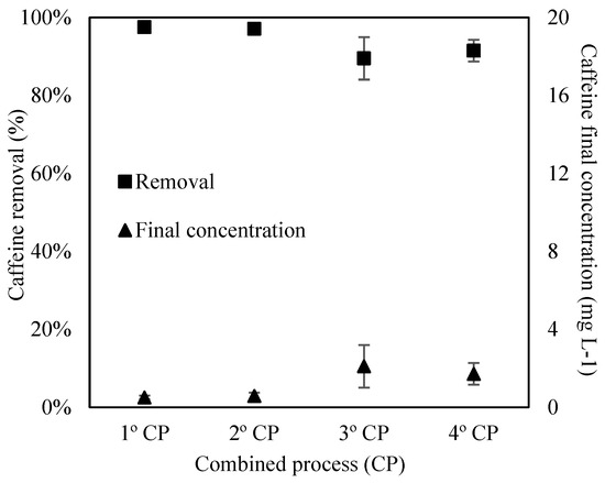 Furthermore, 4 cycles of the combined process were carried out aiming to evaluate the viability of GAC regeneration. The second, third, and fourth cycles were carried out with the same activated charcoal as the first cycle and with new caffeine solutions (20 mg L−1). The experiments were conducted in triplicate and the adsorbent regeneration efficiency (RE) was evaluated at the end of each cycle of the combined process through Equation (4).