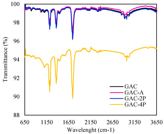 GAC FTIR spectrum, where -A is after adsorption, -2CP is after second combined process, and -4CP is after fourth combined process.
