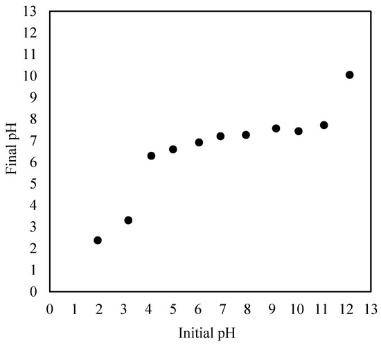 Furthermore, the pHPCZ obtained for commercial GAC in this study was 7.36, as shown in Figure 13. In other words, at this pH, the net charge of the adsorbent is zero. For pH values lower than 7.36, the surface charge of GAC becomes positive and favors the adsorption of anions due to the higher concentration of hydronium ions in the solution. By comparison, for pH values greater than 7.36, the surface charge of GAC is negative and favors the adsorption of cations due to the higher concentration of hydroxyl ions in the solution [25]. Similar results for the pHPCZ were found by De Carvalho et al. [38] and De Oliveira [45] who used the same solid as our adsorbent, obtaining a pHPCZ equal to 7.35 and 8.04, respectively.