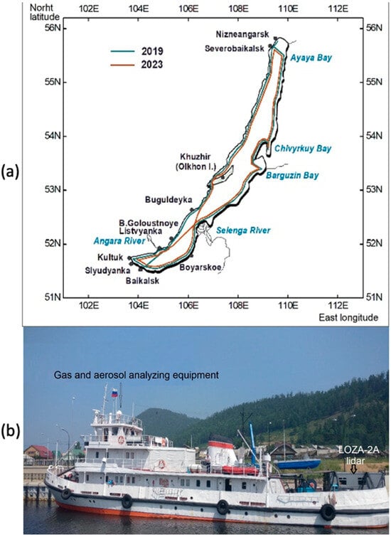 Routes of comprehensive scientific expeditions in the water area of Lake Baikal, 2019 and 2023 (a); RV “Akademik V.A. Koptyug” and location of measuring equipment on the upper deck, 2019 (b).