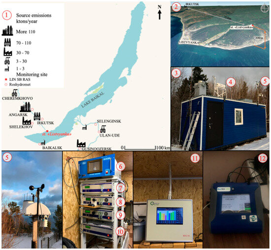 Location and equipment of the atmospheric monitoring station “Listvyanka”: (1) layout of the Listvyanka reference station with the largest air pollution sources at Lake Baikal; (2) station location on the hilltop; (3) the main module of the reference station; (4) MTP-5 temperature profiler; (5) Sokol-M1 meteorological complex; (6) RA-915AM spectrometer; gas analyzer; (7) Hg; gas analyzer; (8) K-100 (CO); (9) R-310A gas analyzer (NO2 and NO); (10) CV-320 gas analyzer (SO2); (11) BAC-10 aethalometer analyzer eBC; (12) DUSTTRAK 8533 dust analyzer (PM10, PM2,5, and PM1.0).