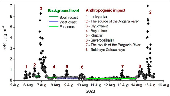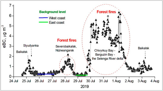 The first studies to measure the concentration of equivalent black carbon (eBC) were carried out at Lake Baikal in 2018 using a portable three-length device, “Portaethalometer A1” [30]. The highest eBC was observed near large coastal settlements, for removals with air masses along the valleys of large tributaries of the lake, in zones of intense navigation, and during wildfires.