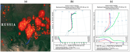 Satellite image of the territory near Lake Baikal: (a) with wildfire sites in the north (28–29 July 2019); (b,c) backward trajectories calculated using the HYSPLIT models for 29 July 2019 (GMT) (http://fires-dv.kosmosnimki.ru, accessed on 1 June 2024).