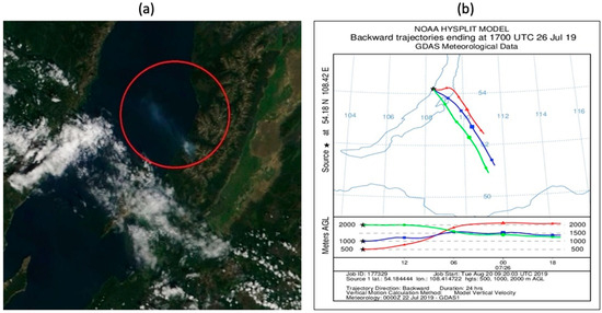 Satellite image of the central basin of Lake Baikal: (a) with smoke plume from a wildfire near Sosnovka Bay (red circle); (b) backward trajectories calculated using the HYSPLIT model for 26 July 2019 (GMT).