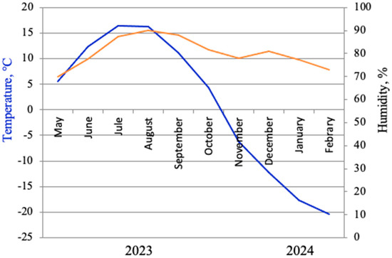 Dynamics of mean monthly temperature and humidity at the Listvyanka station in 2023–2024.