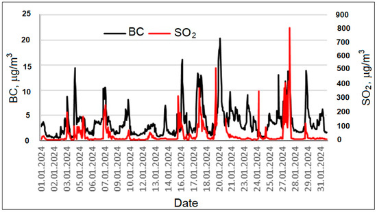 Large coal-fired thermal power plants of the Baikal region are the main common source of eBC and SO2. Figure 9 shows mean hourly concentrations of these components at the Listvyanka station in January 2024, the coldest period of the year, clearly indicating the direct connection between these pollutants in the air. The concentration dynamics of eBC and sulfur dioxide at the monitoring station strongly depended on the variability of wind direction given in Table 4 for the summer and winter seasons. The maximum concentrations of these pollutants in the air were associated with northwesterly (310 = 340°) air mass transport from the Irkutsk–Angarsk industrial complex located 70 to 100 km from the Listvyanka station.