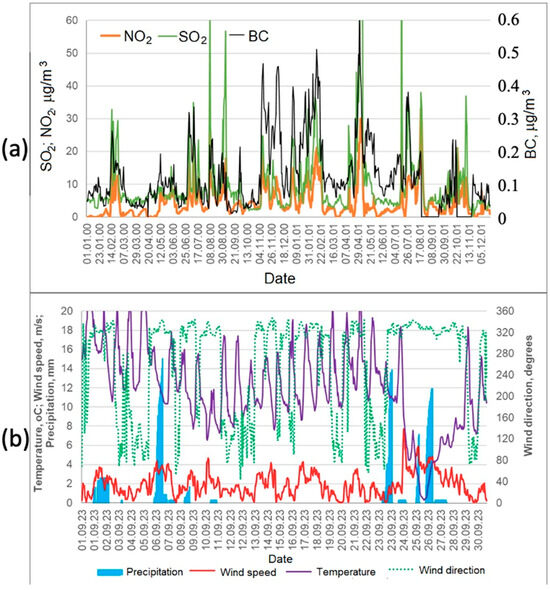 Mean hourly concentrations of BC, nitrogen oxide, and sulfur dioxide (a) and meteorological parameters at the Listvyanka station (b), September 2023.