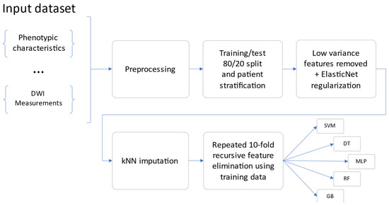 We divided our data into training and test subsets with an 80–20 split that sought to ensure a balance of our response variables across the training/test datasets. Given the longitudinal nature of our dataset, comprising multiple MRI sessions per patient over time, we employed a stratification approach that involved ensuring that all sessions pertaining to a single patient were exclusively included in either the training or the test set, but not both. This was achieved through a randomized allocation process until no participants were found in either the training and test sets to avoid data leakage. Due to the high dimensionality of our data, it was necessary to perform aggressive feature reduction to include only the features exhibiting the top 10% highest variance. We used mean imputation across the remaining features to make it possible to employ regularization techniques for further reduction. We normalized our data; then, for each independent neuropsychological and neurobiological response variable, we employed ElasticNet [40,41] regularization with alpha ranging from 0.5 to 0.8 to reduce the number of features. The final features expected to offer the most discriminatory power for our response variables were scaled and re-imputed by using k-NN nearest neighbour imputation [42]. Imputation using k-NN was initially unable to perform complete imputation with such a wide dataset, forcing us to initially use mean imputation until we could perform ElasticNet regularization. Subsequently, for each neuropsychological and neurobiological response variable, we employed a repeated 10-fold cross-validation method to ensure robustness with various models, including support vector machines [42,43], decision trees [44], random forest [45], multi-layer perceptron [46], and gradient boosting [47]. The repeated cross-validation approach minimized variability in performance metrics due to random partitioning. We evaluated our results by using RMSE, MAE, and R2 metrics. This multi-step process is depicted in Figure 1.