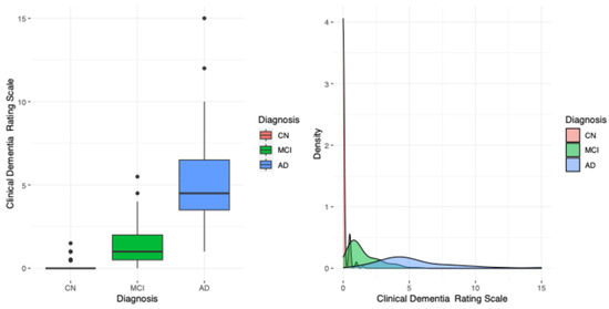 As expected [55], the Clinical Dementia Rating-Sum of Boxes (CDR-SB) scores, a comprehensive measure of dementia severity, exhibited very high chi-squared values (), indicating pronounced differences across disease stages, thus supporting CDR-SB’s ability to stage severity of Alzheimer dementia and mild cognitive impairment. The observation of a high chi-squared value for the CDR-SB test along with an observed long tail depicted in the density plot found in Figure 2 suggests that the MCI and AD disease stages have more variability and more extreme values than CN, signalling a potential sensitivity for early detection of conversion from CN.