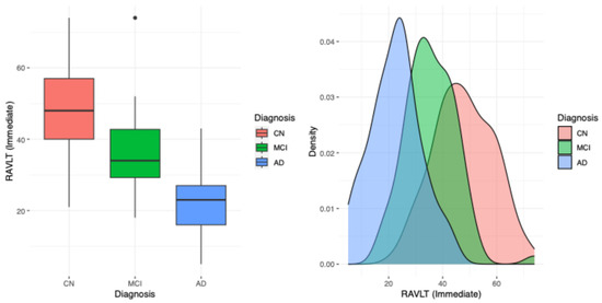The Rey Auditory Verbal Learning Test (RAVLT) immediate recall scores exhibited significant differences among the diagnostic groups (CN, MCI, and AD), as evidenced by the Kruskal–Wallis test (). Figure 3 demonstrates how the RAVLT scores progressively decrease from cognitively normal individuals to those with MCI and further to individuals with AD.