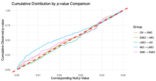 Among the 1.3 million tract measurements assessed, 5394 tract measurements (0.3%) exhibited statistically significant differences among groups after performing pairwise Wilcoxon Rank Sum Tests with Benjamini–Hochberg correction [53] (p < 0.05). In the cumulative distribution shown in Figure 4, we note the curve deviation of the statistics from the null distribution increases modestly as participants transition into later stages of cognitive impairment, suggesting tract anomalies may be more pronounced in later stages of the disease. The curve deviations of the comparison of mild cognitive impairment (MCI) to late mild cognitive impairment (LMCI) (blue) are larger than other groups, suggesting potentially higher effect sizes [59].