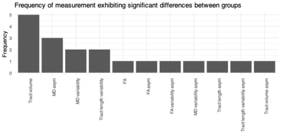 Figure 5 presents a frequency plot of measurement types identified as significant during the transition across the MCI → LMCI → AD cognitive impairment stages. The plot ranks measurement types by their frequency of occurrence, emphasizing which measurements are most prevalent in highlighting tract anomalies associated with cognitive decline. The higher-frequency measurements relate to the morphometrics of detected tracts (length and volume) as well as differences in MD as expected [60].