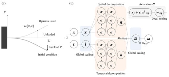 Despite the promising capabilities of PINNs, obtaining a reliable solution can be particularly difficult when solving high-order differential equations, such as fourth-order differential equations in structural dynamics. These equations are accompanied by high-order gradients that can easily vanish during neural network training. Therefore, previous studies describing dynamic beam bending based on PINNs are surprisingly rare, even though it is a fundamental concept in engineering problems [,]. While the PINN solution for static beam bending has been extensively studied [,,,], its dynamic counterpart has not. The relevant high-order differentials in a dynamic beam bending problem, fourth-order in space and second-order in time, could limit the acquisition of a reliable solution based on PINNs. This limitation will be confirmed later in this study. Resolving high-order differential equations remains one of the challenges with PINNs, prompting an active search for advanced strategies, including elaboration in loss construction, the implementation of adaptive activation, and domain decomposition.