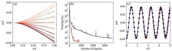 Figure 2a illustrates the beam displacement profiles obtained from the STD-PINN (solid lines) compared to those of the truncated solution (dots), where 10 consecutive snapshots are shown from the initial end load condition for half a cycle of the first bending mode. The predictions of the STD-PINN method exhibit good agreement with the semi-analytic solution. Note that the figure was drawn by amplifying the y-scale to clearly show the beam oscillation. The training procedure and predicted solutions of model 1 and model 2 are further compared in Figure 2b,c. The trend in training loss was plotted according to the training epochs in Figure 2b, where the black and red lines indicate model 1 and model 2, respectively.