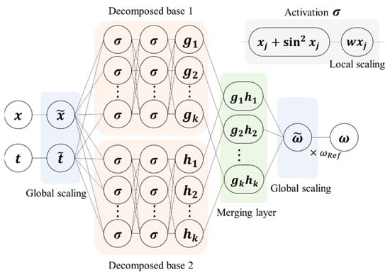 The PINN architecture was constructed as a sequence of the following layers, as schematically illustrated in Figure 3: the global scaling layer at the top, which adjusts the input to the range of −1 to 1; two parallel structures reflecting decomposed bases; a merging layer; and the final global linear scaling with . Whereas the global scaling layers are identical to those used for the free vibration problem, the parallel structures in the middle were designed to take both scaled space and time, in contrast to STD in the free vibration problem. Therefore, the parallel structures in the middle can be denoted as and . Fully connected neural networks composed of two hidden layers and 20 neurons are employed for each of the parallel structures with activation. The outcomes of each structure are merged using elementwise multiplication as , where corresponds to the number of hidden neurons, which is 20. The outputs are superimposed to produce a single value, , using a fully connected layer without activation, leading to , where represents the weights, and represents the bias. The superimposed value is linearly scaled at the last layer to produce the final prediction as .