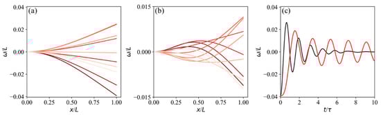 Figure 4 exhibits the predictions of the proposed PINN model for the stable mode (Figure 4a) and the fluttering mode (Figure 4b). The critical behavior of the fluttering cantilevered beam is successfully captured by the proposed PINN model. In Figure 4a, snapshots over one cycle are shown, starting from the release of the initial end load condition, with ten consecutive deflection profiles depicted in chronological order from dark to light red. The amplitude of displacement significantly decayed as the fluid dynamic pressure acted like a damping force. The displacement curve of the cantilever end for prolonged cycles is shown as a black line in Figure 4c, clearly demonstrating that the fluid-dynamic force stabilized the vibration of the cantilever by gradually reducing the amplitude of the oscillation.