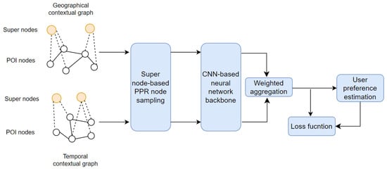 where denotes the PPR score vectors, denotes the propagation matrix, and denotes the initial vector. Using Equation (1), we employ PPR scores to sample POI nodes that exhibit high correlation with each given POI. Taking the geographical contextual graph as an example, for a given POI p, we use PPR sampling to obtain a set of highly correlated POI nodes where nl denotes the sampling size.