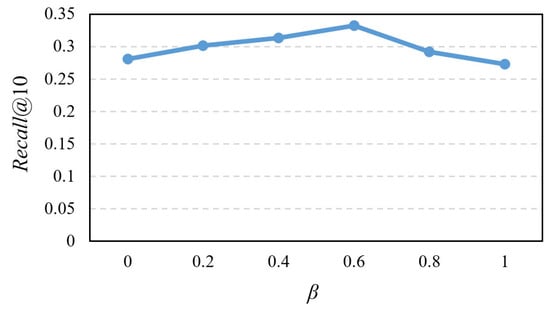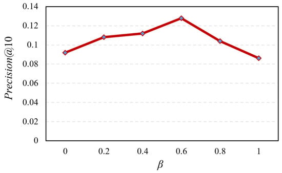 In Equation (4), β is a crucial hyperparameter that controls the contribution of different contextual features to the final POI representation. These POI representations, in turn, influence the modeling of user preferences and ultimately impact the performance of the model in POI recommendation. To investigate the effect of β on model performance, we vary β in {0, 0.2, 0.4, 0.6, 0.8, 1.0} and observe the changes in model performance. The experiments are conducted on the NYC dataset with the length of the recommendation list fixed at 10. The experimental results are presented in Figure 2 and Figure 3.