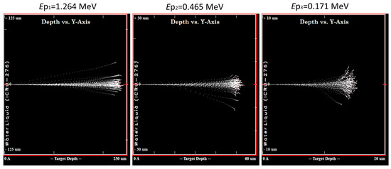 Finally, we accounted for the fact that the three considered recoil protons completely stopped in the water due to their limited ranges. Using the SRIM software (version SRIM-2013, see Ziegler et al. [45]), we calculated their trajectories and energies as functions of penetration depth in SCW. Figure 1 schematically illustrates the total penetration lengths into SCW at 400 °C and 25 MPa (ρ = 0.167 g/cm3) for these protons. The chemistry observed under these conditions represents an average over the proton energies, from their initial energies (i = 1 to 3) down to zero.