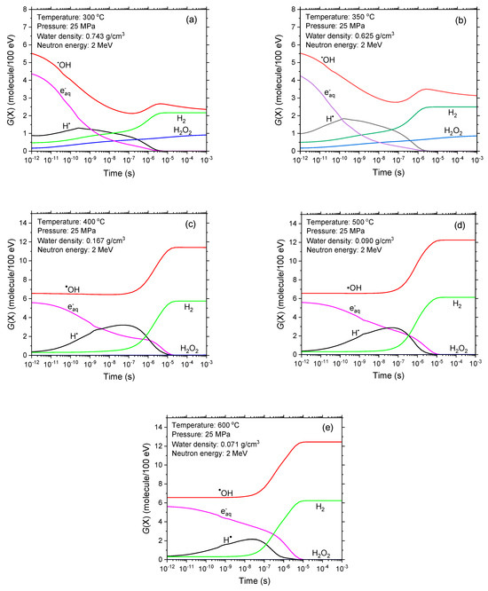 In this work, we present Monte Carlo track chemistry simulations of the time-dependent G values for the primary species (e−aq, H●, H2, ●OH, and H2O2) resulting from the radiolysis of neutral, de-aerated water by monoenergetic 2 MeV neutrons. These simulations cover the temperature range from 300 to 600 °C at a pressure of 25 MPa. We selected 2 MeV neutrons because the in-reactor fission-neutron flux spectrum peaks around this energy [13,21,22]. Calculations spanned from 1 picosecond (ps) to 1 millisecond (ms). Concerning densities at 25 MPa for the studied temperatures, below the critical point of water, they are 0.743 g/cm3 at 300 °C and 0.625 g/cm3 near the reactor core inlet (350 °C). For SCW, densities are 0.167 g/cm3 at 400 °C, 0.090 g/cm3 at 500 °C, and 0.071 g/cm3 at the reactor core outlet (600 °C) [23]. All available data on the physicochemical properties of SCW (such as dielectric constant, Kw, viscosity, etc.) up to 600 °C have been incorporated into the calculations.