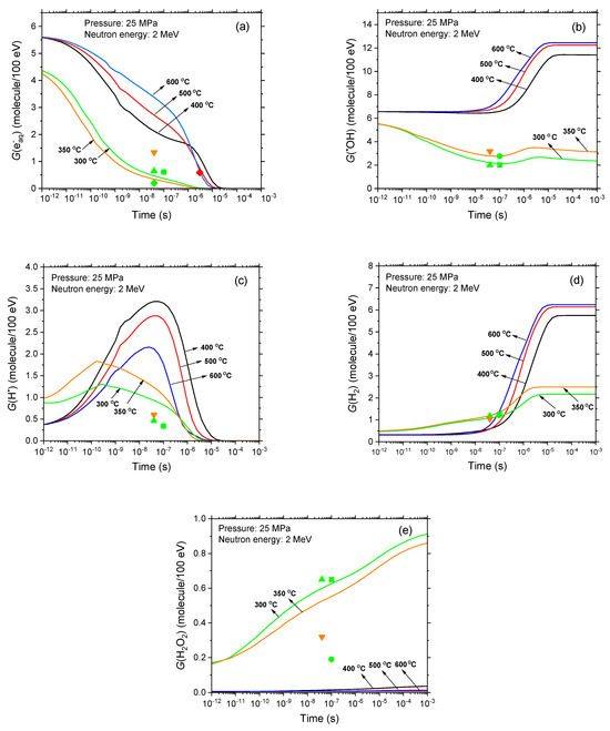 Time evolution of G(e−aq) (a), G(●OH) (b), G(H●) (c), G(H2) (d), and G(H2O2) (e) during the radiolysis of pure, de-aerated water by 2 MeV neutrons at temperatures of 300 (green lines), 350 (orange lines), 400 (black lines), 500 (red lines), and 600 (blue lines) °C at 25 MPa. These calculations are derived from our Monte Carlo track segment (recoil proton) yield simulations over the interval of 1 ps to 1 ms. The symbols represent experimental data; they are color-coded for clarity to match the curves with which they are associated: (!, green) Elliot [30], (,, green) Elliot et al. [47], (7, green) Christensen [48] (recommended mean G values at ~280–300 °C. According to the author, these values are likely accurate within ~25%), and (B, orange) Elliot and Bartels [13]. The symbol (Λ, red) in Panel (a) represents Edwards’ G(e−aq) value of 0.59 molecule/100 eV at 400 °C and 24.8 MPa [49], positioned at an assumed measurement time of ~3 μs [50,51]. Note that all the experimental data at 300 and 350 °C are positioned at the end of the spur/track expansion times, specifically within the range of ~40 to 100 ns [52]. To our knowledge, no experimental yield values for fast neutrons at 500 and 600 °C have been reported to date.