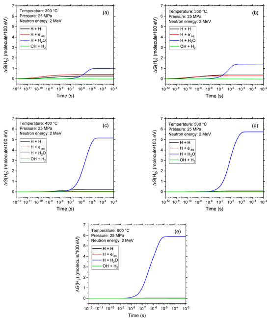 Time-dependent extents ΔG(H2), expressed in molecules per 100 eV, of the main reactions contributing to the generation and decay of H2 during the radiolysis of pure, de-aerated water by 2 MeV neutrons at 300 °C (a), 350 °C (b), 400 °C (c), 500 °C (d), and 600 °C (e) at 25 MPa, calculated from our Monte Carlo track segment (recoil proton) simulations over the interval of 1 ps to 1 ms. These outcomes indicate that the production of H2 is largely driven by the oxidation of water by the H● atom at higher temperatures, particularly in SCW.