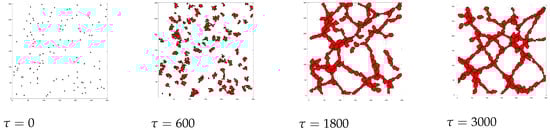 Lattice evolution involved in Cellular Potts model for some values of . White is for medium, red for the unique cell type.