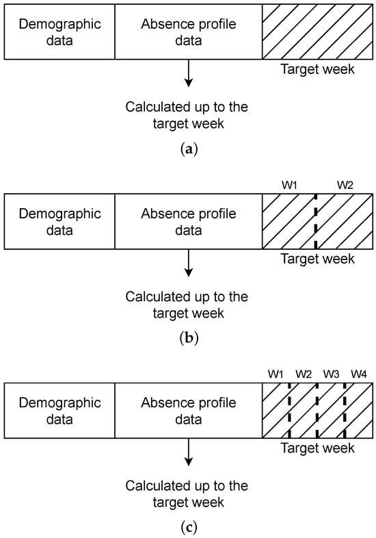 The datasets were created using the sliding-window technique, which is ideal for capturing temporal patterns and trends in time series data. For each employee, we started with the earliest available data and created an observation window that captures all relevant data up to a specific week. The number of days of leave in the current week represents the target attribute for this observation. All lagged attributes that provide historical context are derived from the previous weeks’ data. In the case of a multi-week forecast, the delayed attributes are calculated for the weeks preceding the first week in the target attributes. In Figure 3, we present the sliding window technique for the case of a one-week forecast (Figure 3a), a two-week forecast (Figure 3b) and a four-week forecast (Figure 3c).