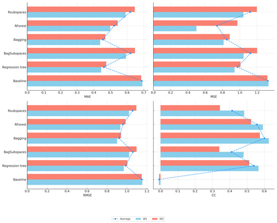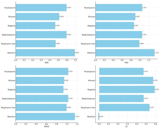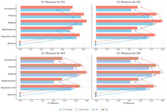Figure 13 presents the results for the CC measure. Again, Bagging demonstrates the highest performance overall, with the highest correlation coefficients (detailed results are available in Table S10 in the Supplementary Materials). The figure also indicates that multi-target models tend to provide slightly better correlation coefficients than single-target models.