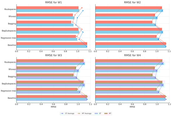 Figure 12 presents the RMSE measure results for all targets, comparing single-target and multi-target models (detailed results are available in Table S9 in the Supplementary Materials). Across the board, Bagging emerges as the best-performing method with the lowest errors. The results also demonstrate that multi-target models generally provide slightly better performance across methods, reflecting their ability to capture correlations between targets.