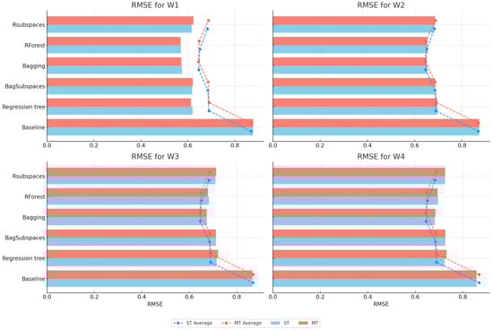 Results for the RMSE metrics comparing single-target and multi-target models for sick leave prediction. The comparison results are presented for each week separately. The ST and MT average lines show the averages of the RMSE error for all four weeks in the single-target and multi-target setting respectively.