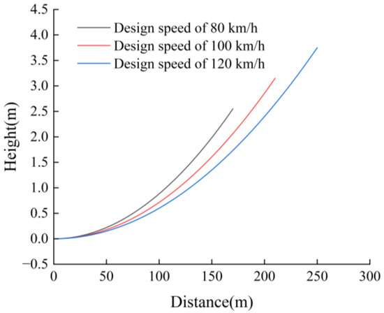 According to Equation (1), we can calculate the coordinates of points on the vertical curve. When the design speeds of the experimental road are 120, 100, and 80 km/h and the longitudinal slope gradient of the vertical curve is 3%, the arrangement of the vertical curves is as it is shown in Figure 2.