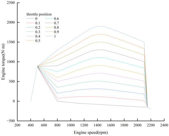 This study involves both conventional fuel-powered and pure electric heavy-duty vehicles. For the conventional fuel-powered vehicle, the powertrain is modeled using the built-in models of the TruckSim software, with the main parameters as follows: engine-rated power of 330 kW, rated speed of 1800 rpm, maximum torque of 2000 N∙m, and an 18-speed manual transmission (18 Spd.MT). Figure 3 shows the torque–speed curve of the conventional fuel-powered vehicle at different throttle openings. For the pure electric heavy-duty vehicle, since the TruckSim 2019 software does not include a built-in module for such vehicles, the powertrain is modeled using Matlab, while the other systems are modeled using TruckSim. The complete model of the pure electric heavy-duty vehicle is then constructed through co-simulation between Matlab and TruckSim.