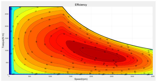 The motor is the core component of electric vehicles. Generally, there are three methods for motor modeling: magnetic field modeling, motor and its drive system modeling, and motor external characteristic modeling. Since this study does not involve the working principles of the motor, we have chosen the modeling method based on the motor’s external characteristics. We obtained torque–speed characteristic curves and efficiency characteristic curves of the selected motor based on experimental data, as shown in the following Figure 4 and Figure 5, and used them as the basis for model establishment. Table 4 presents the basic parameters of the selected drive motor.