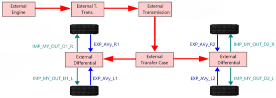 Currently, TruckSim only provides simulation models for conventional vehicles. To model pure electric heavy-duty vehicles, it is necessary to modify the built-in vehicle powertrain model by disconnecting the internal power system and using an external Simulink model to provide the power, thereby constructing a pure electric heavy-duty vehicle model. Specifically, this is achieved by changing the vehicle’s drivetrain in TruckSim to an external differential and directly applying the motor torque from the Simulink motor model to the wheels or axles. The configuration process in TruckSim is illustrated in Figure 6.