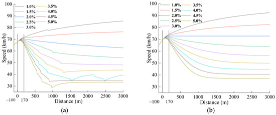 From Figure 7, it can be observed that there are significant differences in the speed variation of heavy-duty vehicles under different longitudinal slope conditions. When the slope is 1.0% and 1.5%, heavy-duty vehicles can accelerate from the starting point to 3000 m, but their longitudinal acceleration gradually decreases. When the slope is between 2.0% and 5.0%, heavy-duty vehicles accelerate on the horizontal road segment and enter the vertical curve segment. However, due to the influence of slope resistance, the longitudinal acceleration of the vehicle begins to decrease until the power is insufficient to balance the slope resistance, at which point the vehicle begins to decelerate. After traveling a certain distance, the speed of the vehicle no longer decreases, remaining in a balanced state, which is referred to as the equilibrium speed. Each slope corresponds to an equilibrium speed. Before reaching the equilibrium speed, the steeper the slope, the faster the speed decreases, and the smaller the corresponding equilibrium speed value. Moreover, the distance required to reach the equilibrium speed becomes shorter as the slope increases.