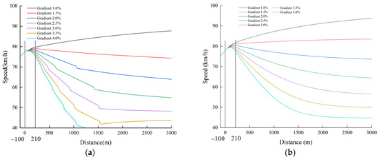 A simulation test was conducted on the vehicle’s performance at a design speed of 100 km/h on a road with grades ranging from 1.0% to 4.0%. As shown in Figure 8, the horizontal axis at −100 marks the starting point of the test road, 0 marks the beginning of the vertical curve, and 210 m marks the starting point of the graded section.