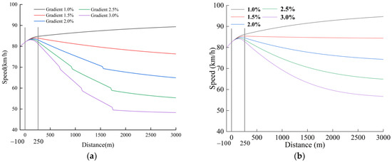 Pure electric and traditional fuel-powered heavy-duty vehicles exhibit significant heterogeneity in dynamic performance. As illustrated in Figure 7, Figure 8 and Figure 9, under the same longitudinal slope conditions, compared to traditional fuel-powered heavy-duty vehicles, the acceleration and deceleration processes of pure electric heavy-duty vehicles are smoother, with smaller fluctuations in driving speed, higher speed at the same distance, and larger equilibrium speed values. The pure electric heavy-duty vehicle studied in this paper employs hub motor drive configurations, where each motor is driven by a corresponding fixed-ratio reducer. This design eliminates the traditional clutch, automatic transmission, and differential, thereby improving transmission efficiency. Furthermore, the motors possess the characteristics of rapid response and high torque output, enabling them to provide the required torque quickly during climbing, resulting in smoother acceleration and deceleration processes and maintaining higher driving speeds. In contrast, the engine of traditional fuel-powered heavy-duty vehicles requires a certain amount of time to respond to the action of the accelerator pedal, necessitating a shift from a high gear to a low gear and increasing torque to overcome slope resistance. The gear shifting is particularly noticeable when driving on steep slopes, as shown in Figure 7a, where the acceleration and deceleration processes of traditional fuel-powered heavy-duty vehicles are unstable with a noticeable jerkiness, and the speed at which they reach a stable state is relatively low.