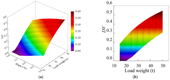 Based on the analysis above, it is evident that when the longitudinal slope gradient is steep, pure electric heavy-duty vehicles attain their highest speeds on gradual vertical curve sections and reach their lowest speeds on straight longitudinal slope sections during uphill climbing. Analyzing the influencing factors of climbing speed for pure electric heavy-duty vehicles reveals that on the experimental route, the slope primarily affects the vehicle’s minimum driving speed on straight uphill sections, while the initial climbing speed affects the vehicle’s maximum speed on both straight and gradual vertical curve sections. Factors such as the load weight and the power-to-weight ratio, as inherent vehicle characteristics, exert influence throughout the entire climbing process on the experimental route, affecting the vehicle’s speed. As shown in Figure 10a, within the range of slope values and load weight , DV generally exhibits an increasing trend with increasing gradient and load weight, with minor fluctuations observed on the three-dimensional surface. When projecting the three-dimensional image onto the Y-Z plane, as depicted in Figure 10b, DV approximately demonstrates a linear positive correlation with load weight, with the level of dispersion remaining relatively constant as load weight increases.