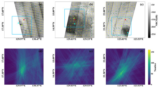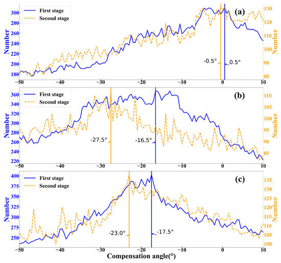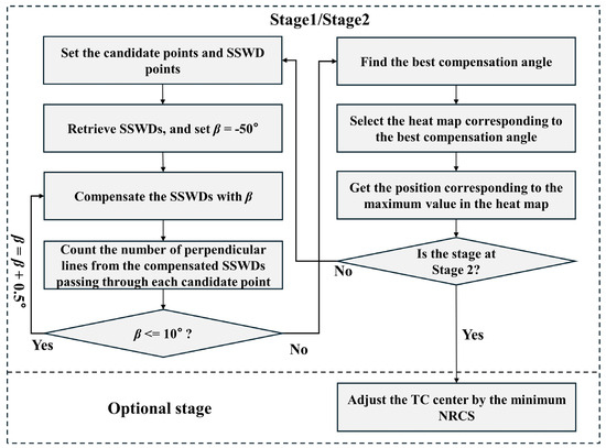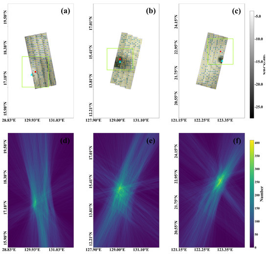 - Estimating the TC center position: A total of 121 compensation angles within [−50°, 10°] were set at an interval of 0.5°. For each compensation angle, the retrieved SSWD is adjusted by adding the compensation angle. Subsequently, the perpendicular lines of these compensated SSWDs are obtained, and the number of these perpendicular lines passing through each candidate point is counted.
