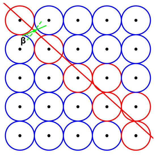 - Estimating the TC center position: A total of 121 compensation angles within [−50°, 10°] were set at an interval of 0.5°. For each compensation angle, the retrieved SSWD is adjusted by adding the compensation angle. Subsequently, the perpendicular lines of these compensated SSWDs are calculated, and the number of these perpendicular lines passing through each candidate point is counted. As illustrated in Figure 2, if the distance from a candidate point to a line is less than M1/2, the line is considered to pass through the candidate point. It should be noted that the rule for determining whether a line passes through a point is different from that in [23].