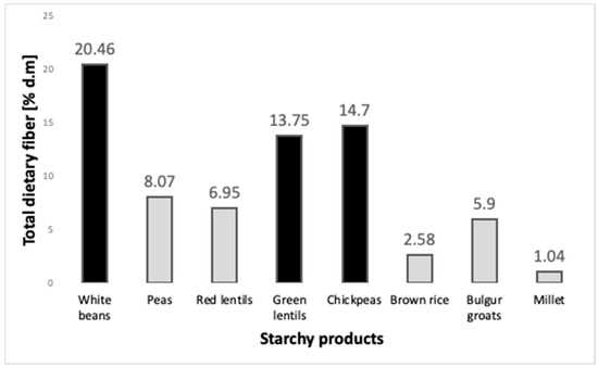 Total dietary fiber content in selected starchy products [%d.m].